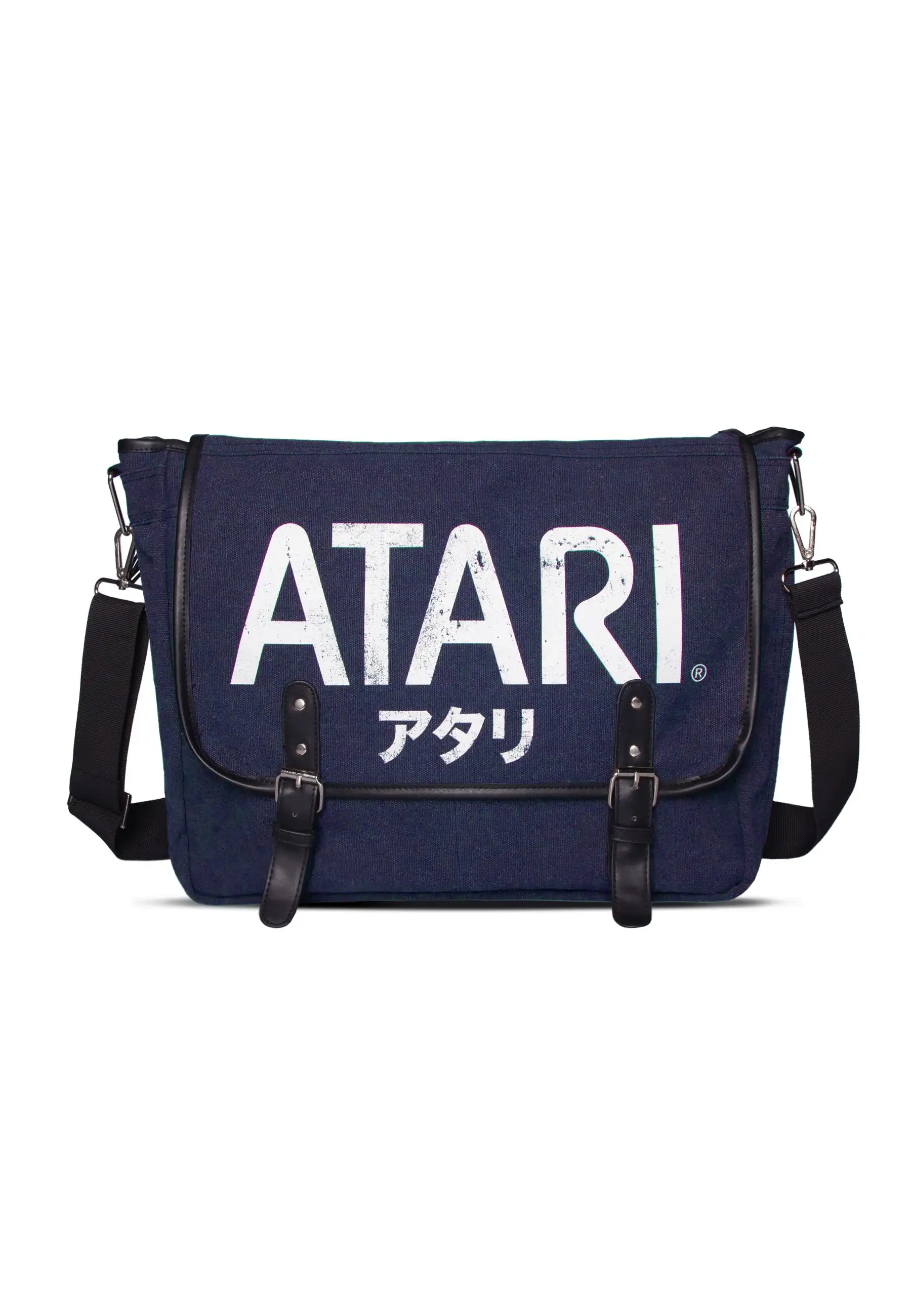 Ta niebieska torba Atari z japońskim logo, dwiema zewnętrznymi kieszeniami, wewnętrznym zamkiem błyskawicznym i dodatkowym, klasycznym logo umieszczonym na boku produktu, świetnie sprawdzi się na mieście i na uczelni.